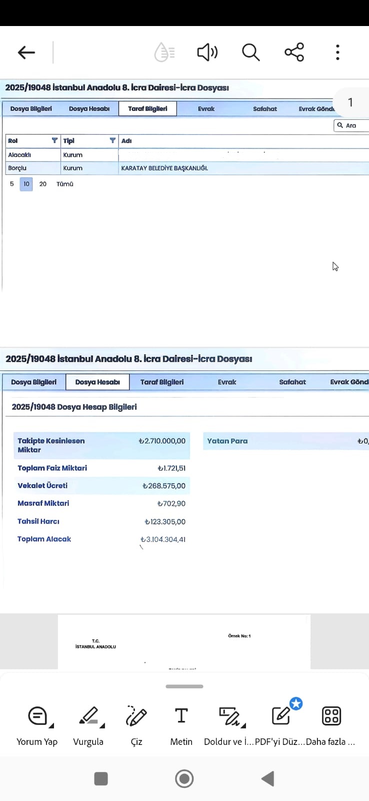 İstanbul Anadolu Adliyesi 8. İcra Dairesi kayıtlarına göre İ.Y. Y. Y. İthalat İhracat Sanayi ve Ticaret A.Ş., Karatay Belediye Başkanlığı’na karşı 2025/19048 numaralı dosya üzerinden icra takibi başlattı.