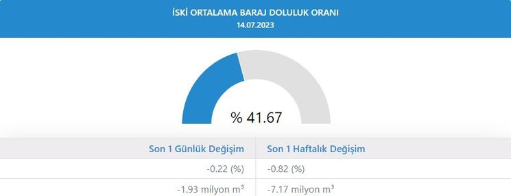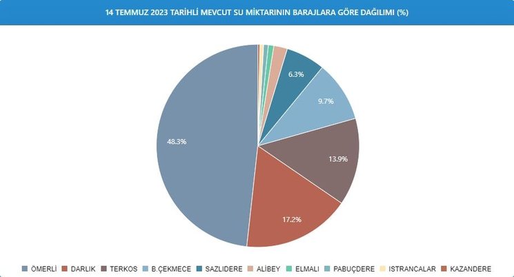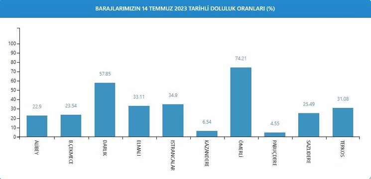 İstanbul'da barajların sadece Ömerli ve Darlık Barajı'nın doluluk oranı yüzde 50'yi geçti. Alibey Barajı yüzde 22,09 olarak açıklandı. Sazlıdere barajı yüzde 25,49 doluluk oranına sahip. Pabuçdere Barajı'nın doluluk oranı ise yüzde 4,55 olarak açıklandı.