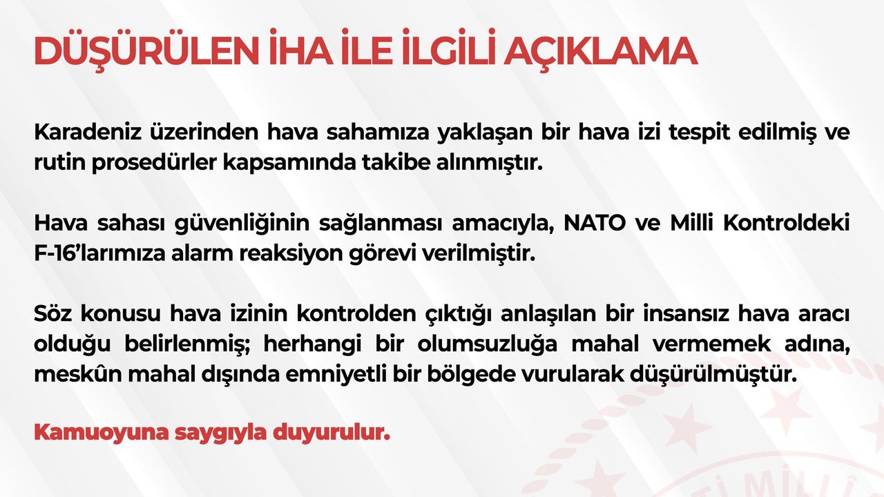 Açıklamada, Karadeniz üzerinde hava sahasına doğru ilerleyen bir hava hedefinin tespit edilerek rutin prosedürler çerçevesinde takibe alındığı belirtildi. Hava sahası güvenliğinin sağlanması amacıyla NATO ve ulusal kontrol görevine tahsisli F-16 savaş uçaklarının alarma geçirildiği ifade edildi.