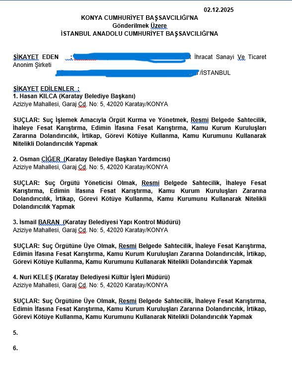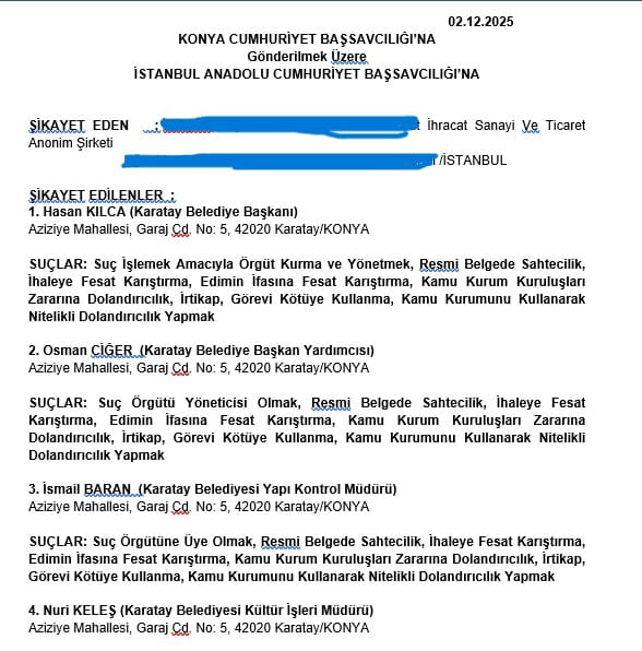 02 Aralık 2025 tarihli suç duyurusu, İstanbul’dan Konya Cumhuriyet Başsavcılığı’na gönderilmek üzere hazırlandı. Başvuruyu yapan Şirket: Karatay Belediyesi’nde örgütlü bir yapılanma bulunduğunu ve bu yapının ihalelerden resmi belgelere kadar birçok alanda usulsüzlük yaptığını öne sürdü.